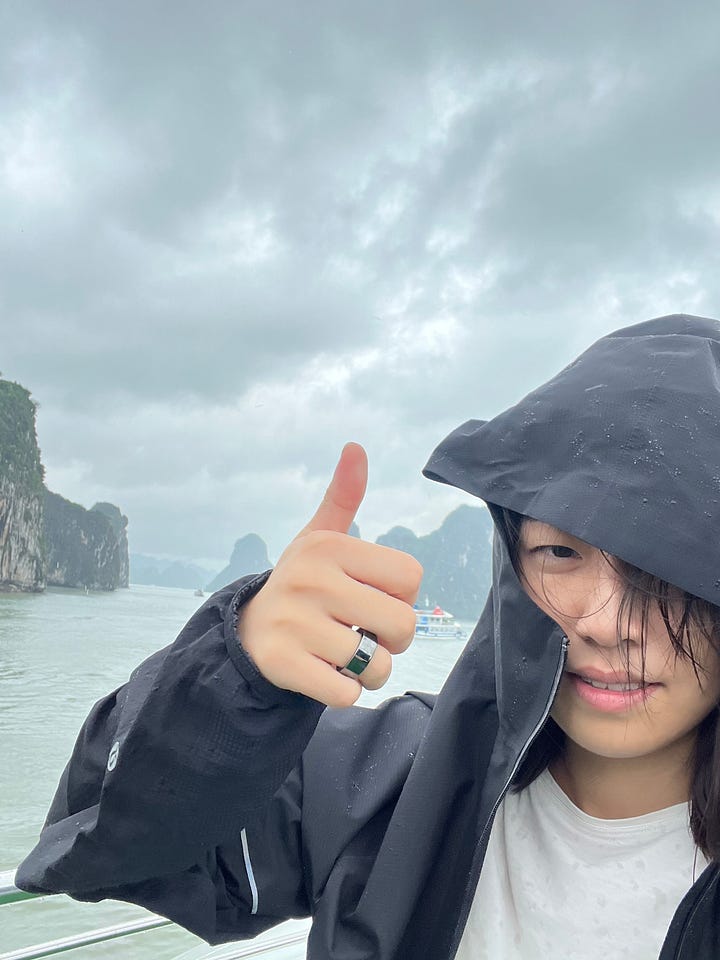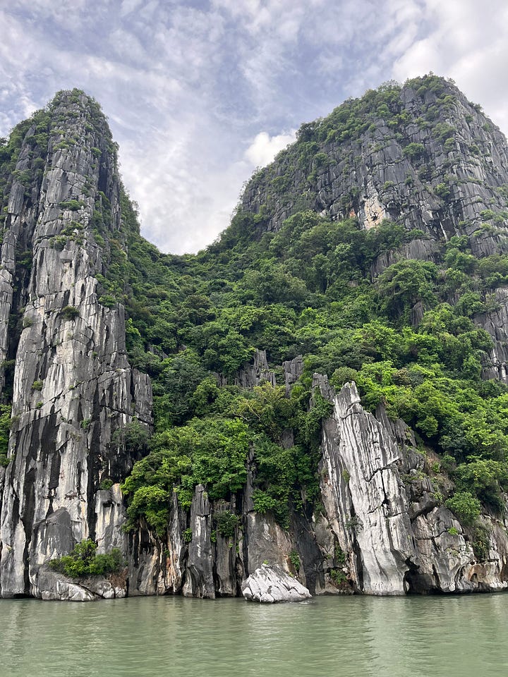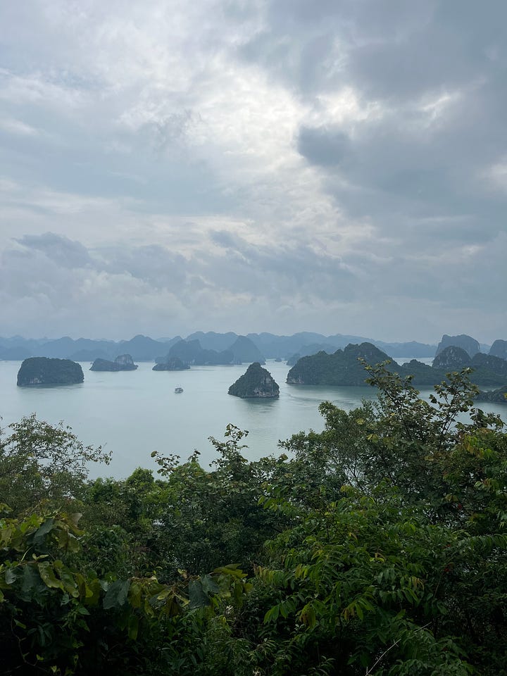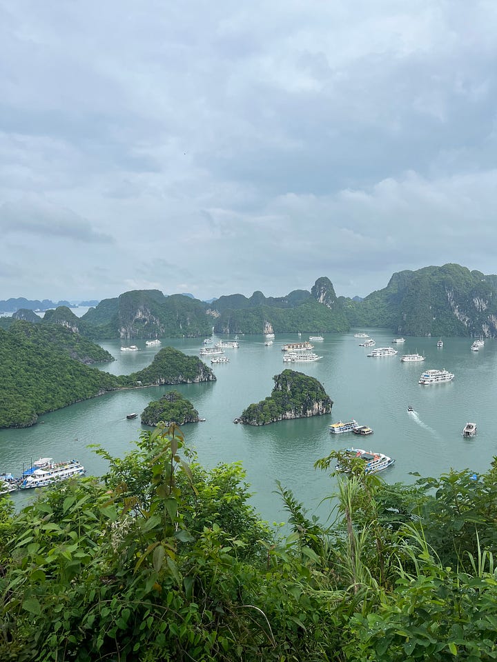 coupled with constant moisture were sounds that stimulated my ears at almost all times (even during sleeping hours - i made makeshift ear plugs out of cotton rounds). the backdrop was always a combination of engines revving and bike horns honking, with the colourful addition of something extra. on beer street, we were bombarded by bars’ enthusiastic summons. on our guided day-trip to ha long bay, i was unable to count on one (if even, two) hand(s) the number of foreign languages spoken by tourists around us. what i also won’t forget, quite randomly, is the 90+ minutes worth of royalty free, 1920’s-esque (if i’m being generous) pop song covers we endured at a “speakeasy” next to our airbnb. my americano was good, though, and so was my sour.